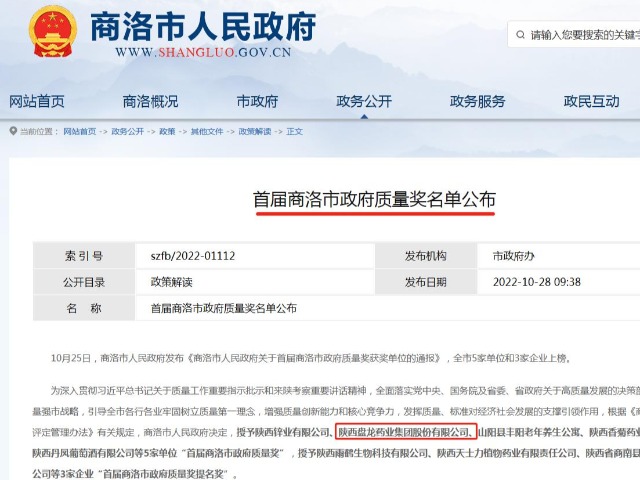 ½ñÄê10ÔÂ⣬ÉÌÂåÊÐÈËÃñÕþ¸®Ðû²¼¡¶ÉÌÂåÊÐÈËÃñÕþ¸®¹ØÓÚÊ×½ìÉÌÂåÊÐÕþ¸®ÖÊÁ¿½±»ñ½±µ¥Î»µÄת´ï¡·£¬Ð±¦gg´´ÔìÆæ¼££¨ÒÔϼò³Æ£ºÐ±¦gg´´ÔìÆæ¼£Ò©Òµ£©µÈ5¼Òµ¥Î»»ñµÃ¡°Ê×½ì...